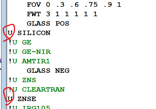 GLASS POS ! 指定正透镜玻璃材料G D-FK61GLASS NEG ! 指定负透镜玻璃材料G H-ZF883、由2延申到正负透镜的搭配,记录在:镜头设计中透镜材料的选择及搭配 4、接2,更改了材料(选用Synopsys的红外材料库Unusual,用U表示)后运行报错:GLASS-TABLE ERROR OR CONFLICT WITH MULTIPLE CORES(玻璃表错误或与多个核心冲突)。找到原因:增加材料时,U前面不能出现其他字符,空格也不行。